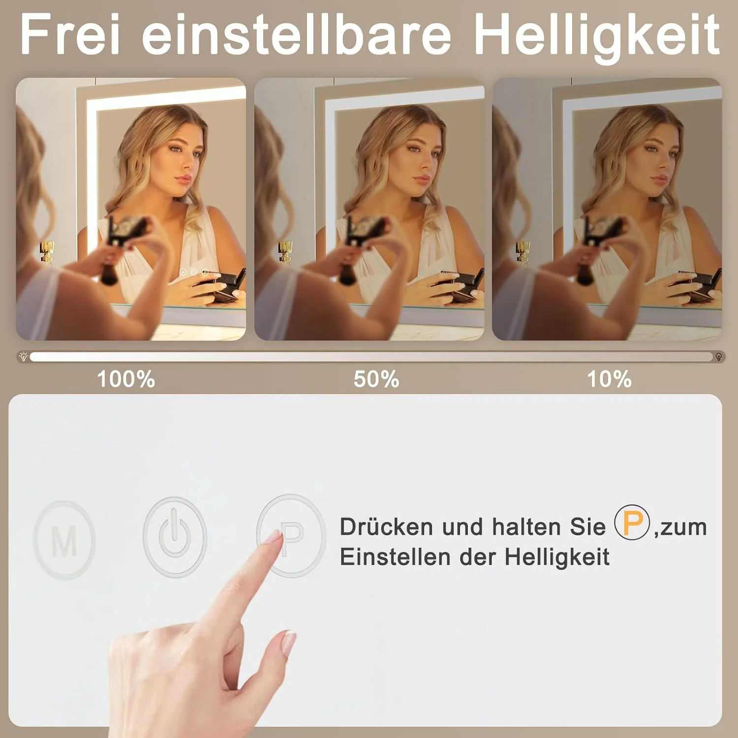 Großer beleuchteter Schminkspiegel 50x40cm mit 3 Farblichtmodi und dimmbarer Intensität