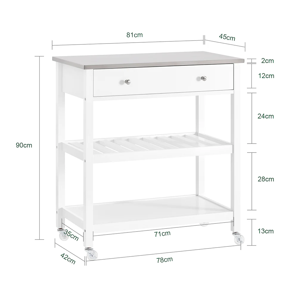 SoBuy Küchenwagen mit Arbeitsplatte und Rollen, Beistelltisch aus Holz in Weiß