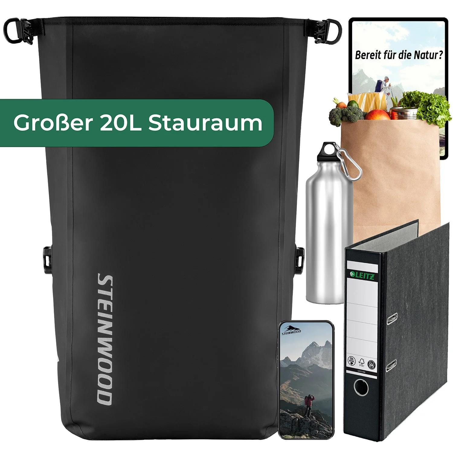 Steinwood Fahrradtasche Gepäckträger 20L wasserdicht, Rolltop Umhängetasche für E-Bike